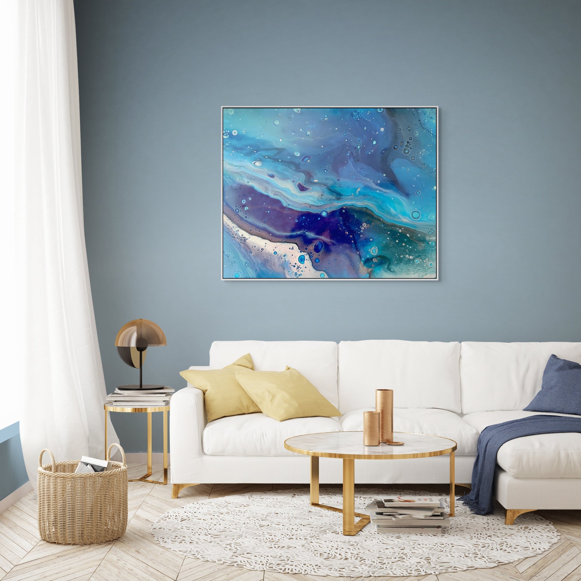 Les nuances de bleus se fondent en volutes élégantes, comme une danse cosmique en apesanteur, tandis que des formes blanches, légères comme des nuages de lait, glissent entre les courants de couleur. De subtils reflets argentés évoquent des étoiles lointaines ou des poussières d’étoiles.