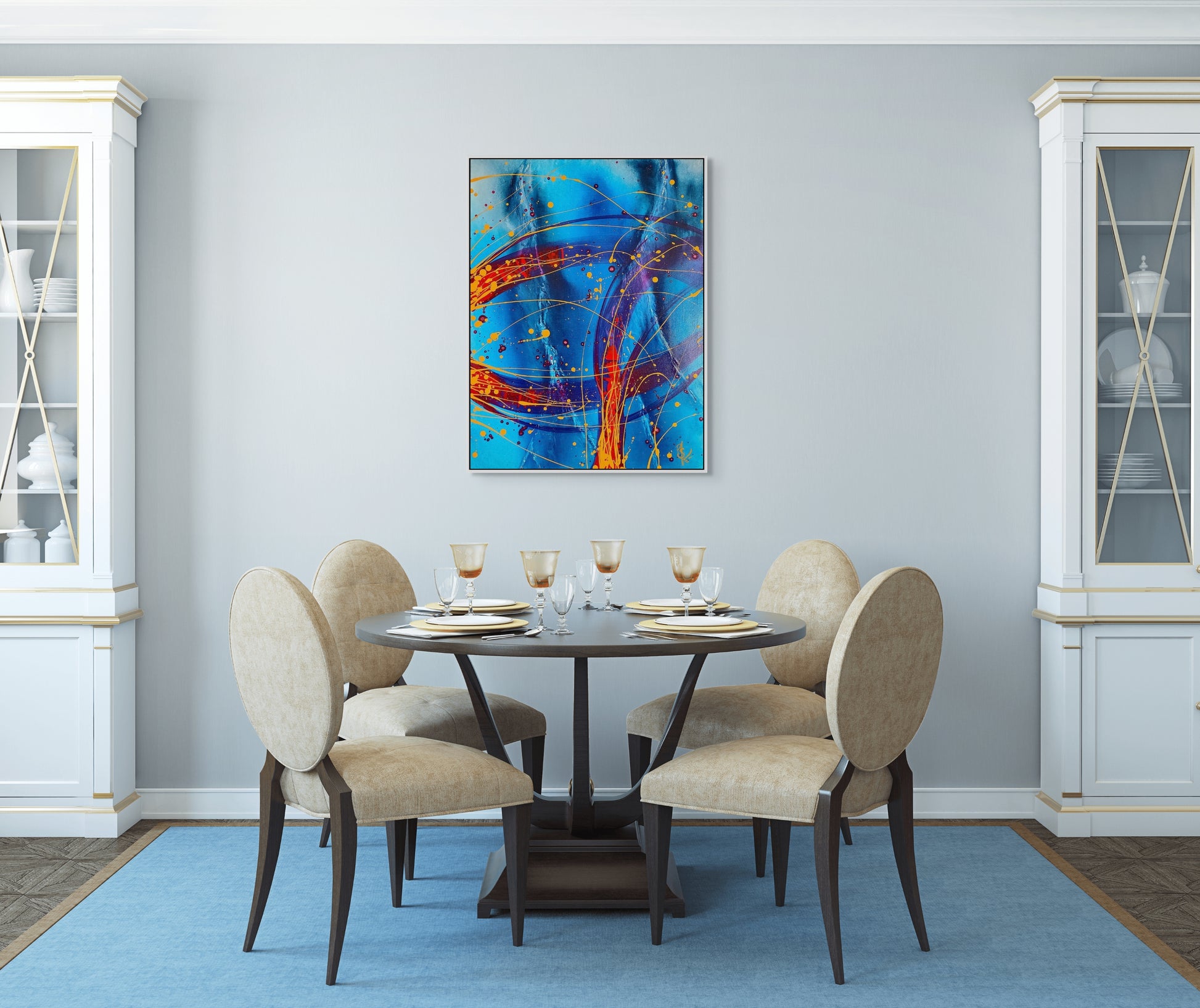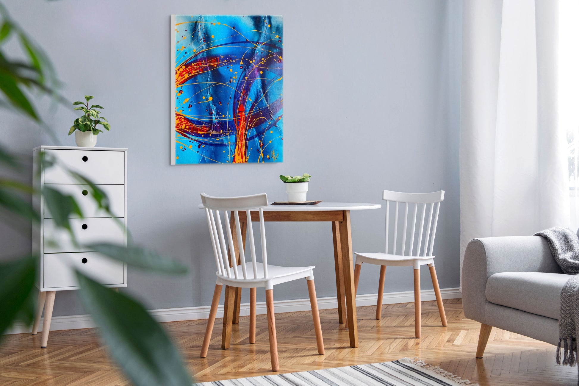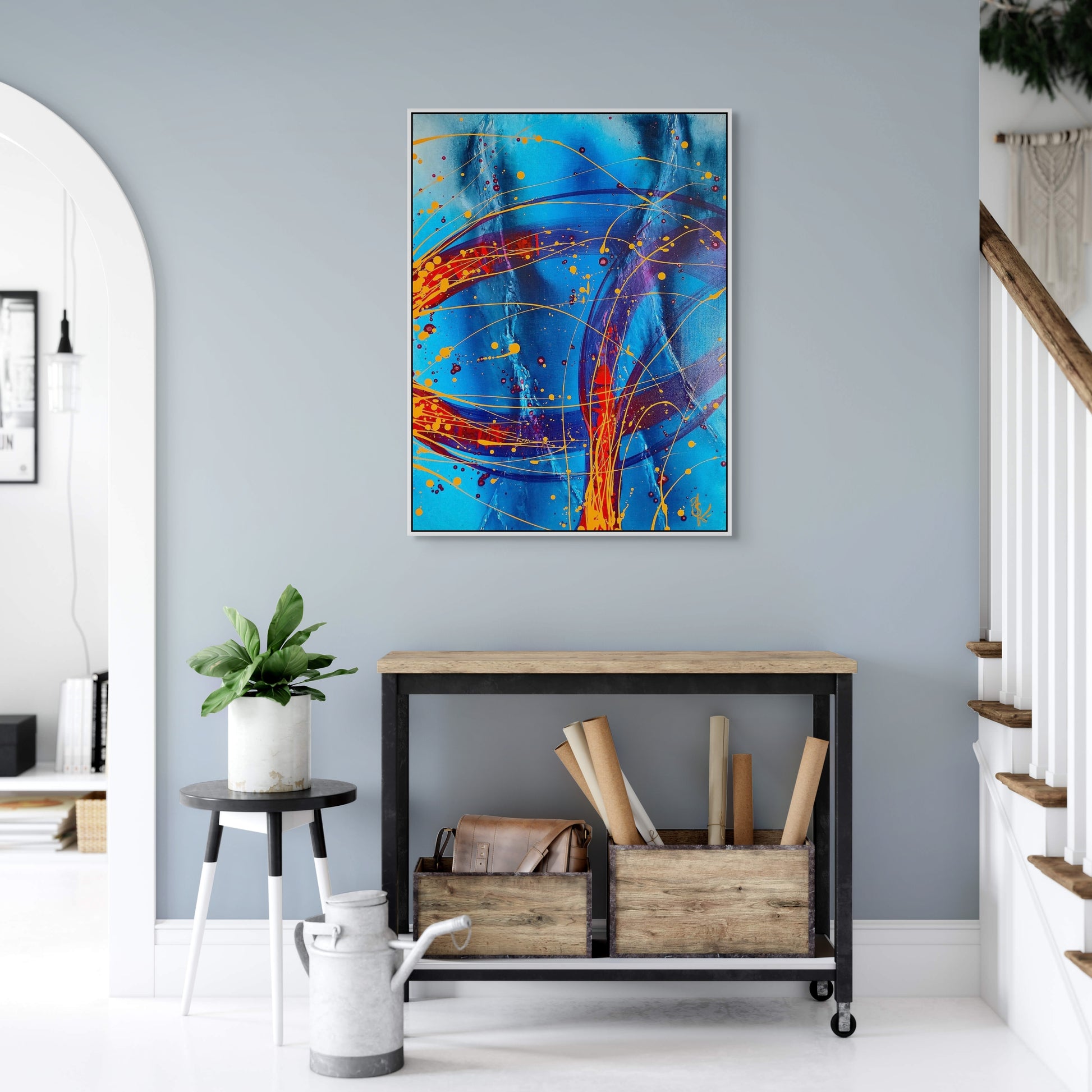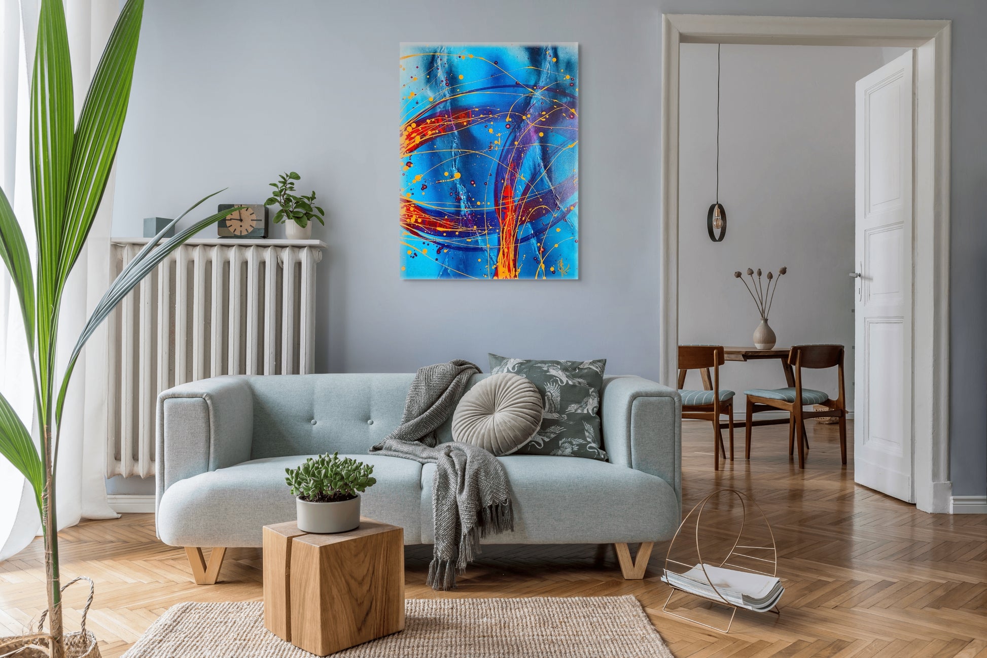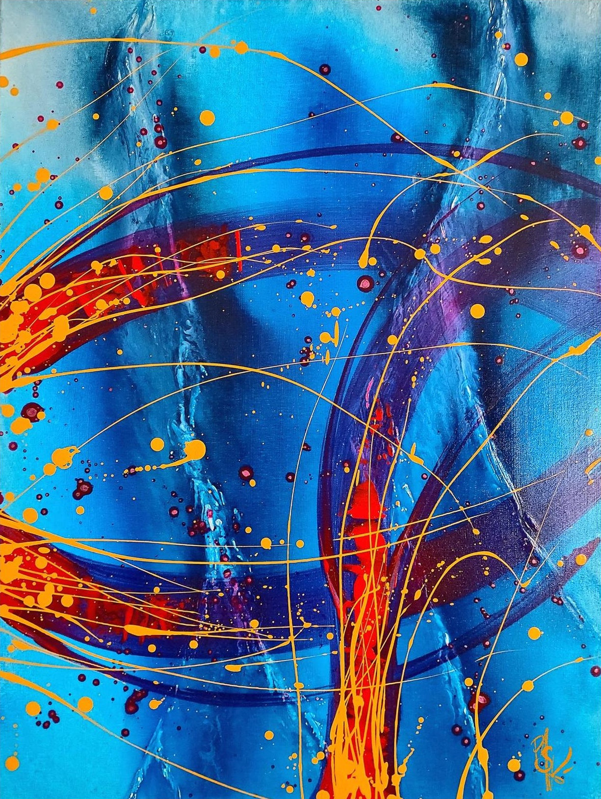 - Tout semble se répondre sans jamais se confondre. Le bleu murmure la distance, le vent, l’attente. L’orange et le jaune crépitent, éclatent, cherchent à embraser l’espace.