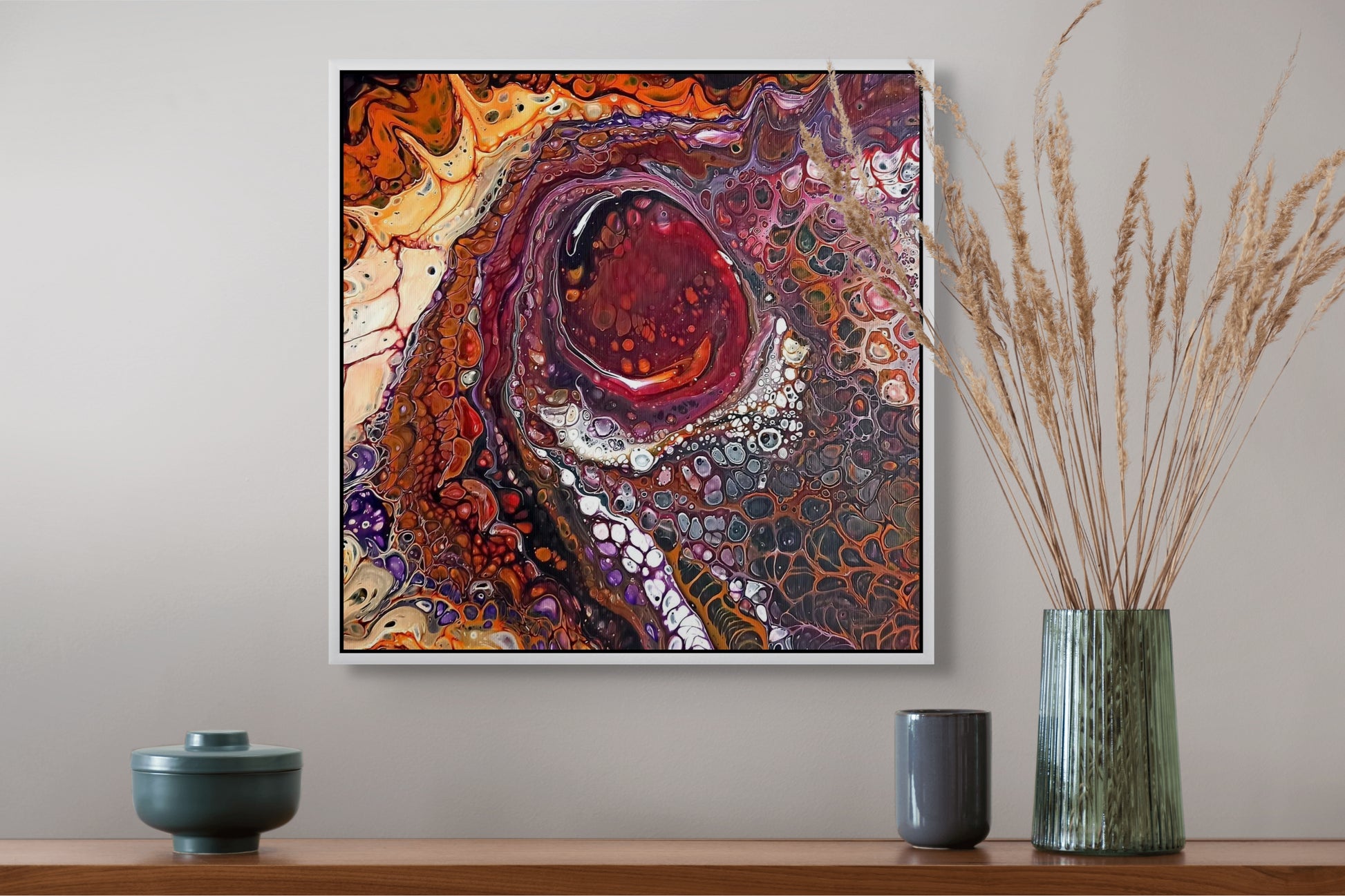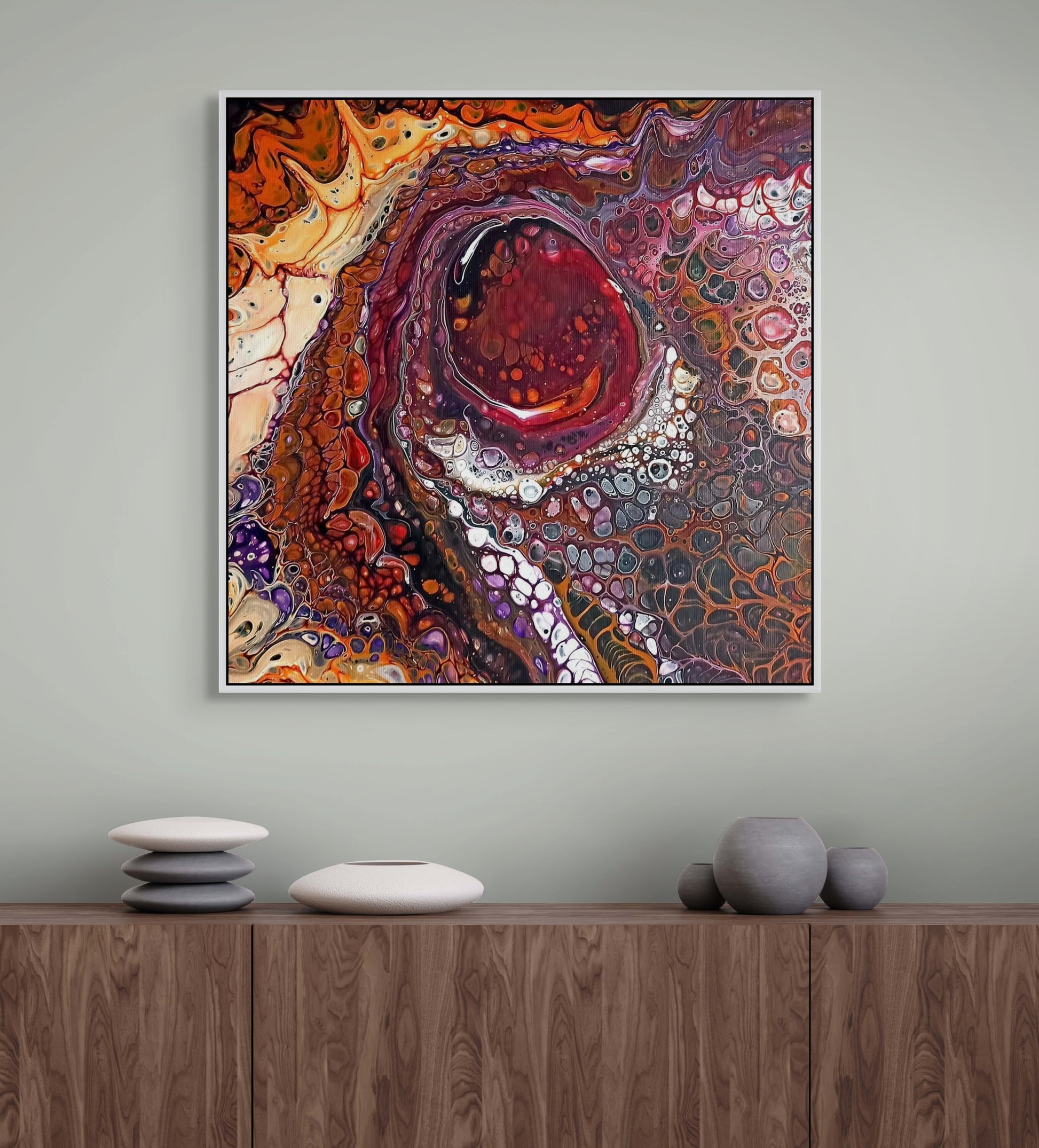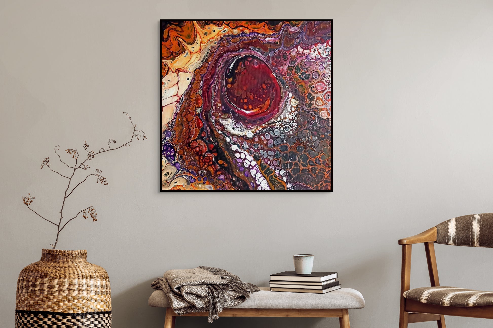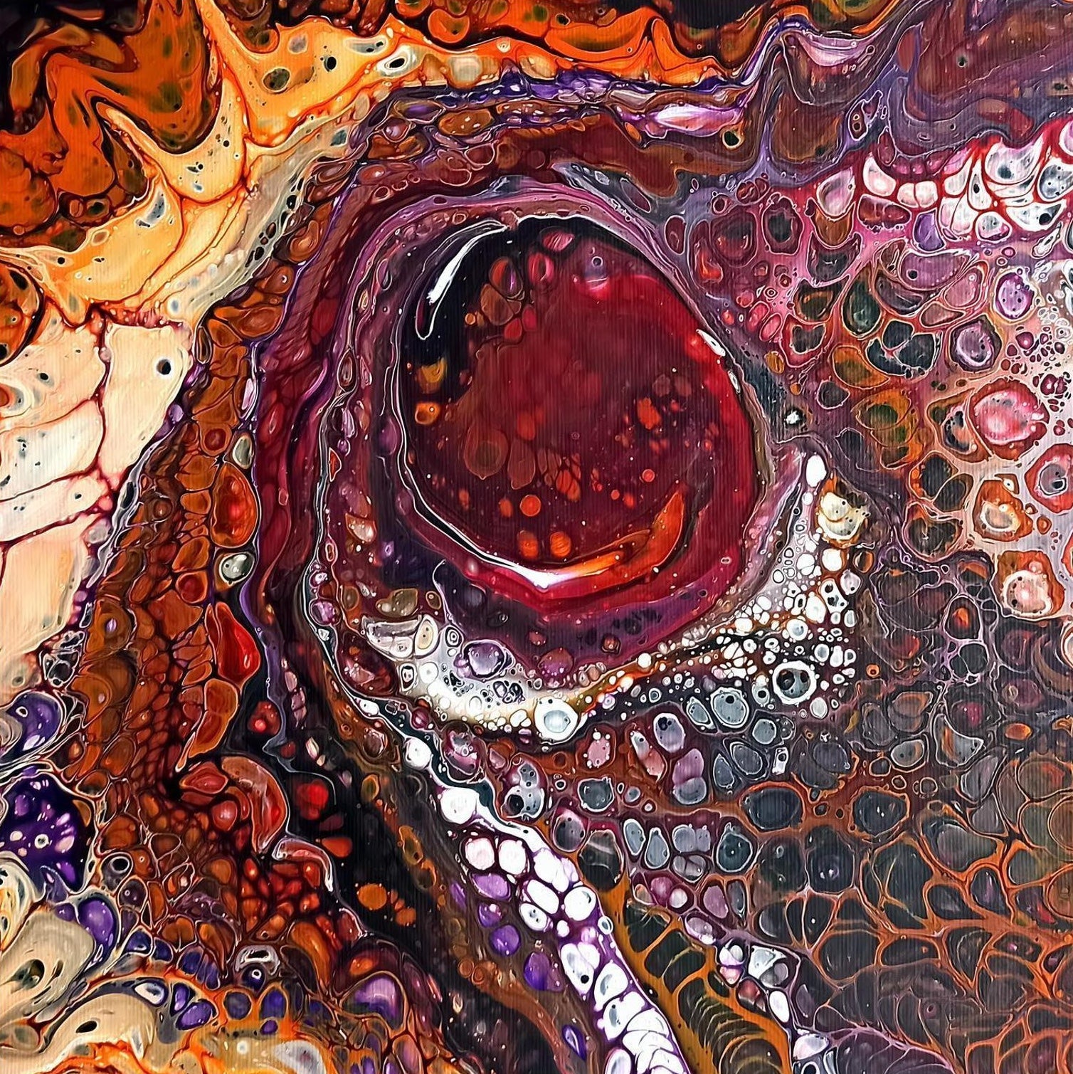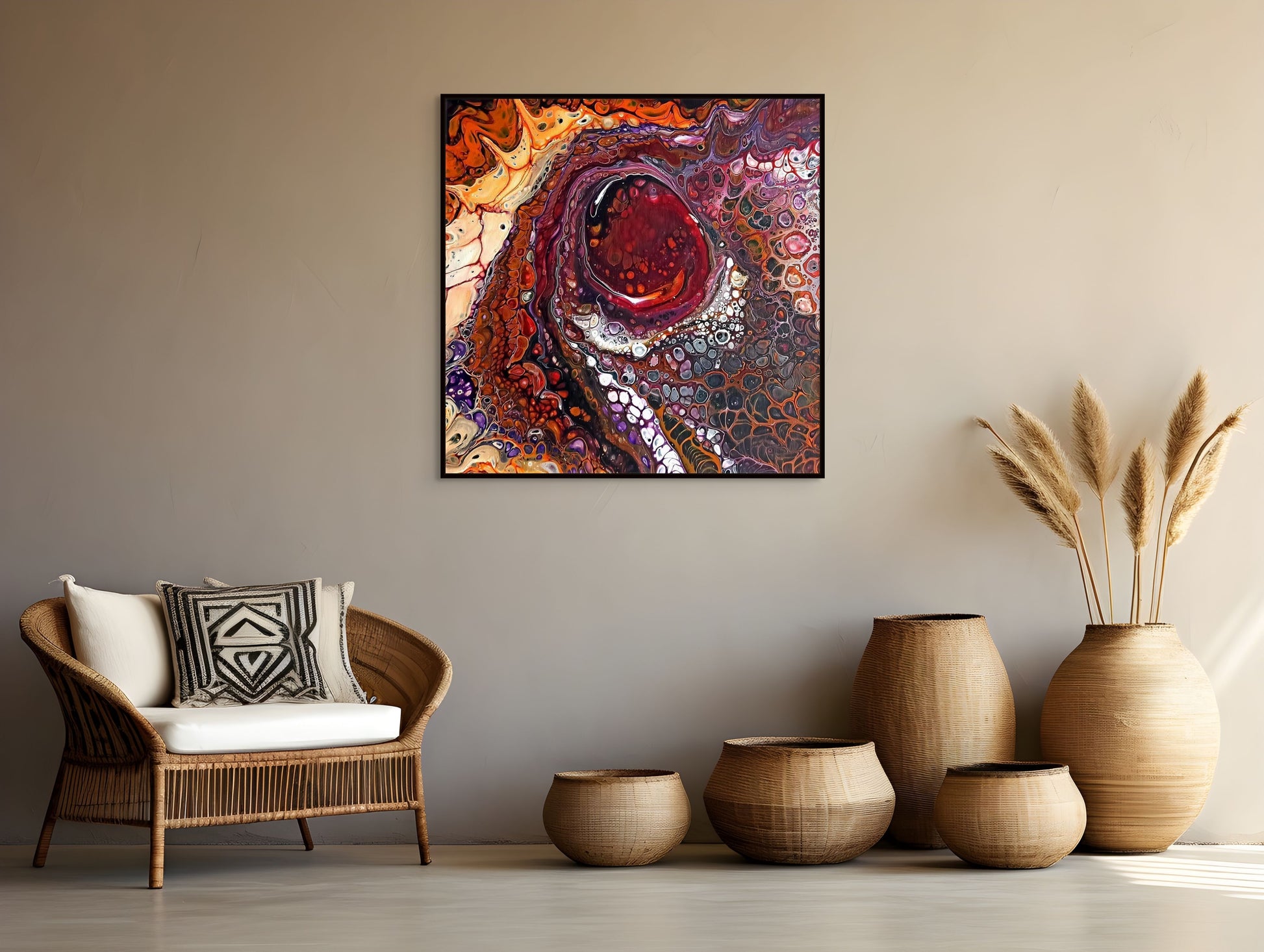 Cette peinture invite à franchir un passage intime, à plonger dans un mouvement organique où la beauté abstraite se fait pure énergie. Portail organique s’ouvre comme un vortex vivant, un œil de feu et de lumière.