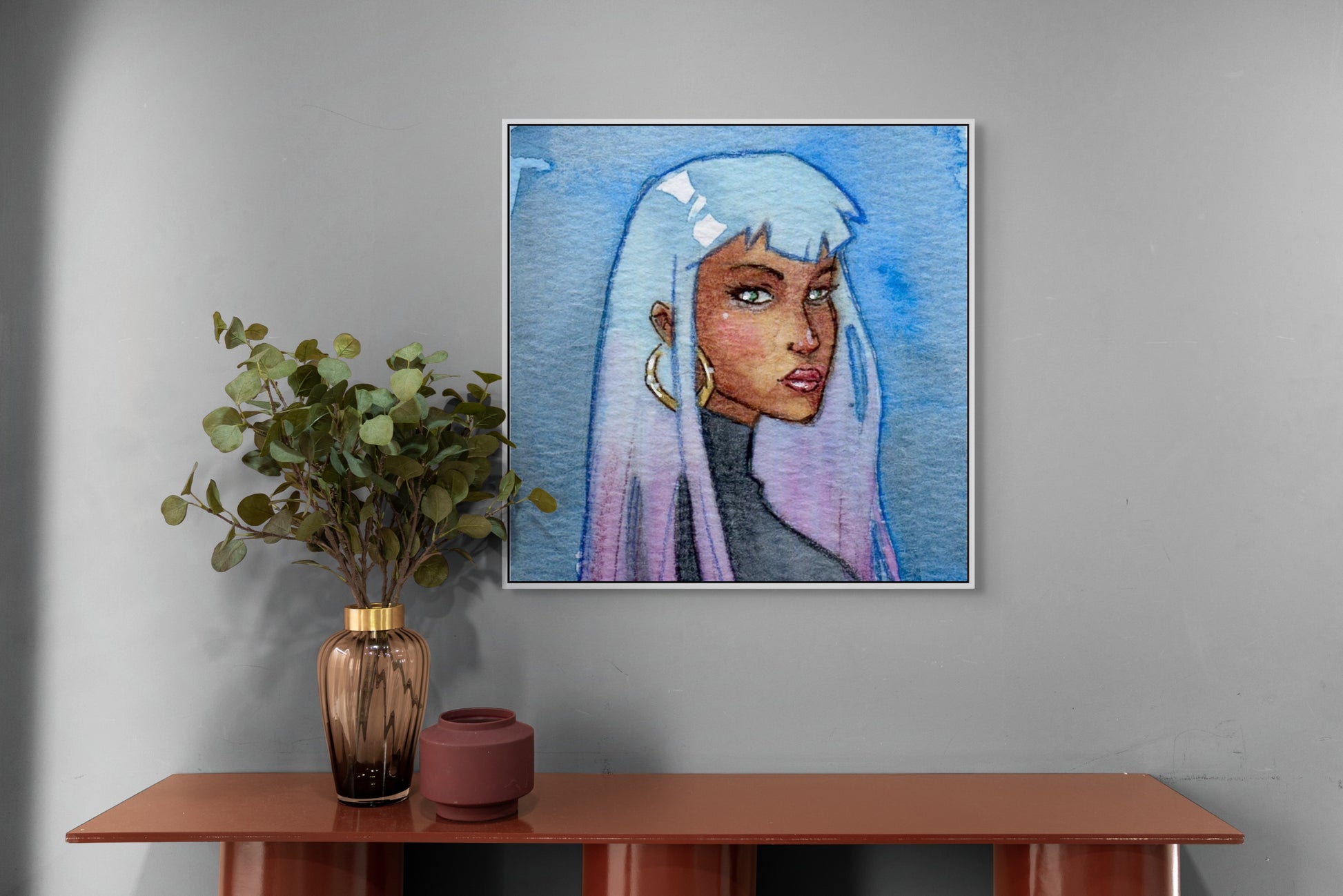 Ce portrait est issu de la série Présences, un ensemble de 35 visages féminins peints à l’aquarelle dans un petit carnet de croquis, au fil d’un exercice quotidien : choisir au hasard une photographie de femme, puis en extraire une présence à travers l'aquarelle et les crayons de couleurs, sans intention préalable.